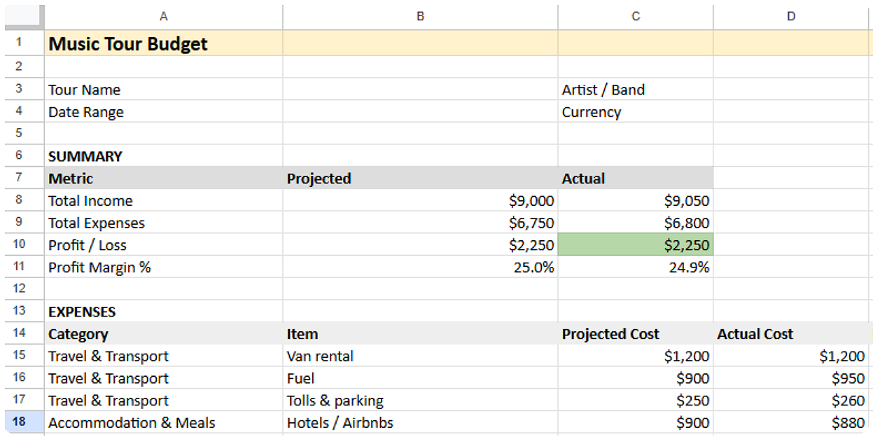 - Use a tool like the Music Tour Budget Template (Google Sheets) to balance both sides and adjust as you go.
