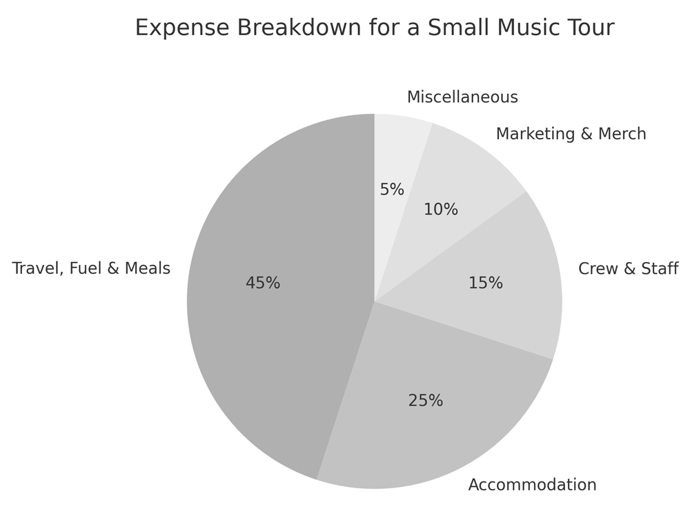 - Expenses: travel, accommodation, crew pay, marketing, merch, and contingency funds.